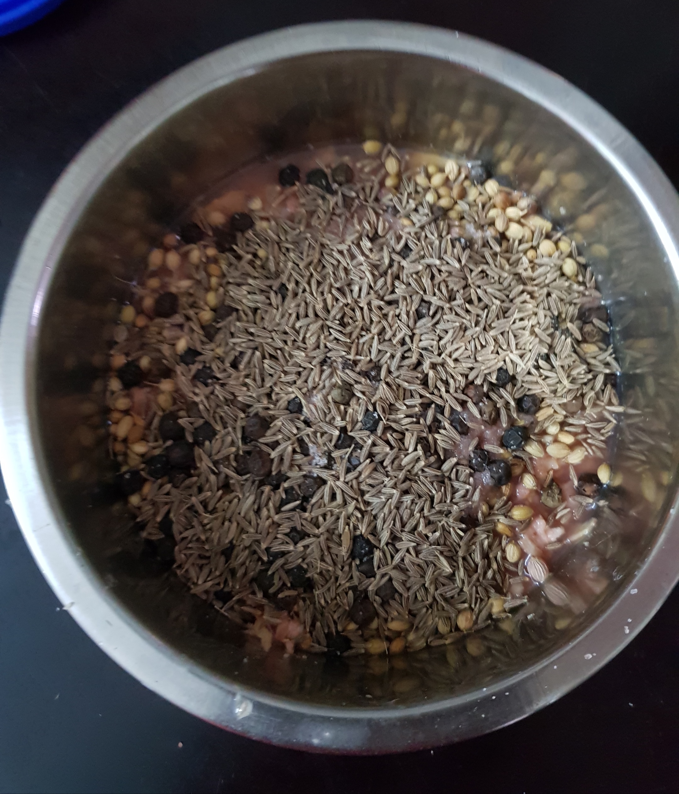 Add coriander seeds, cumin seeds, pepper and salt to the ginger.